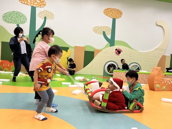 冰雪小屋:在遊戲工作員的協助下,小朋友運用遊戲室的座位,將大大小小的珍珠棉拼砌成小斜台,更嘗試坐著鹿車下滑,是想像在雪地滑行吧!